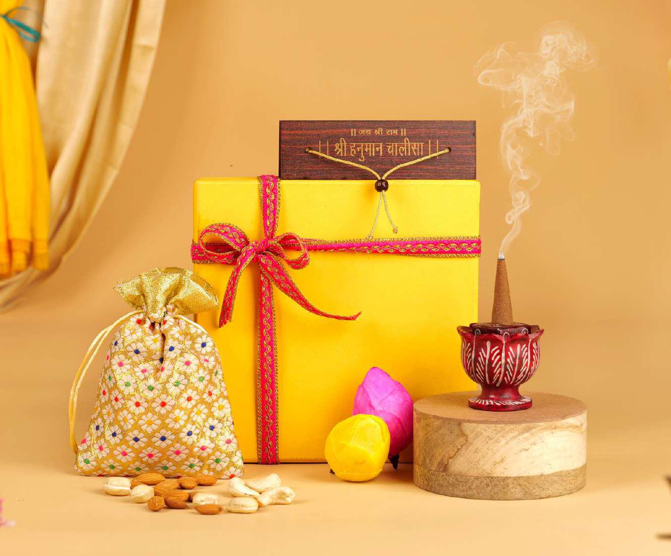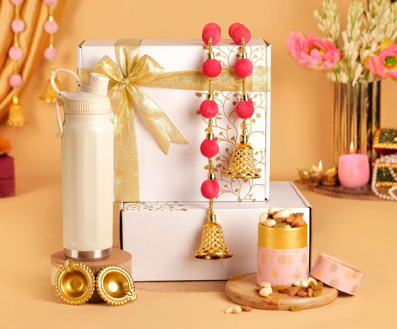 Wedding Gift including decorative hanging bells, a gift box, Diyas, decorative candle